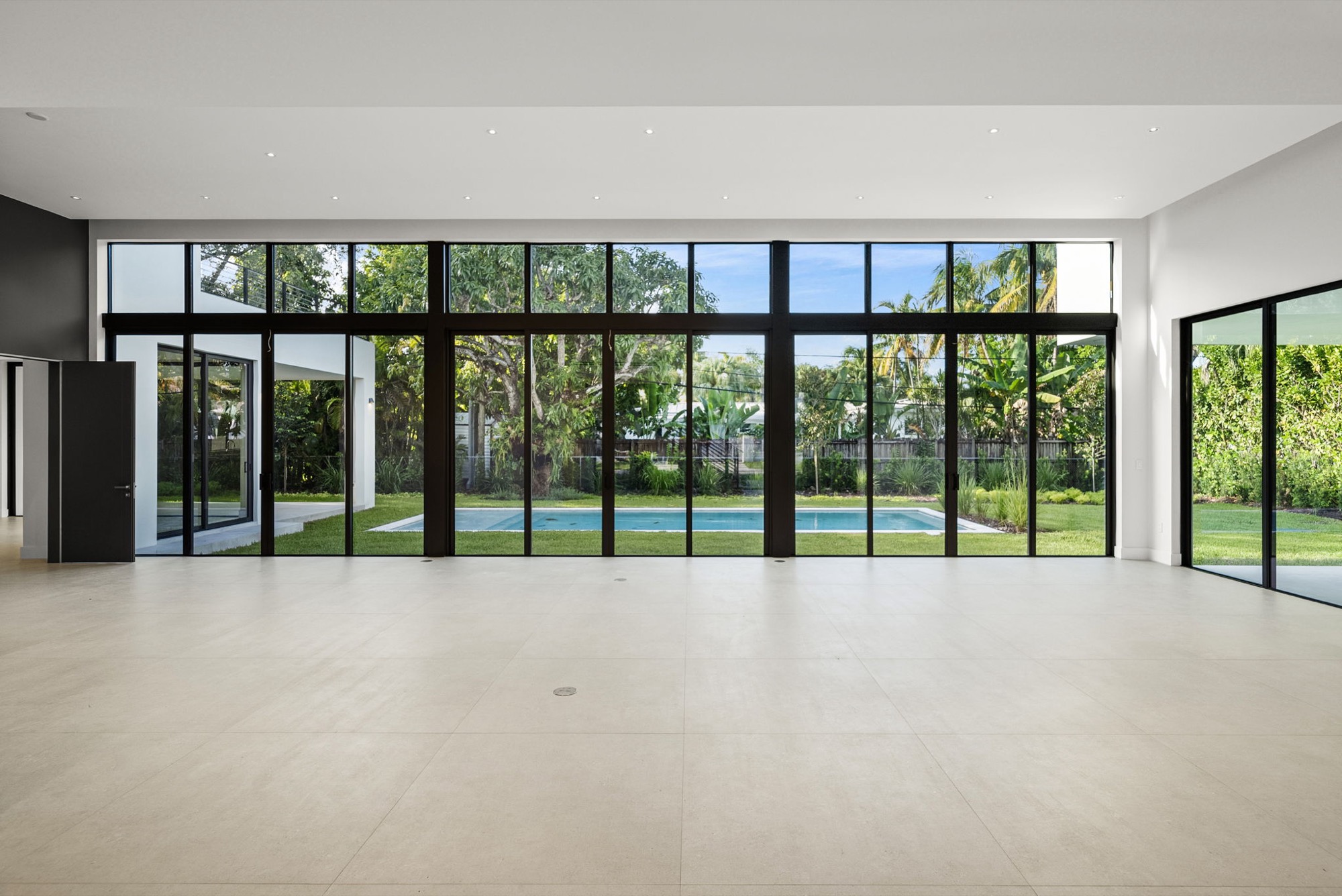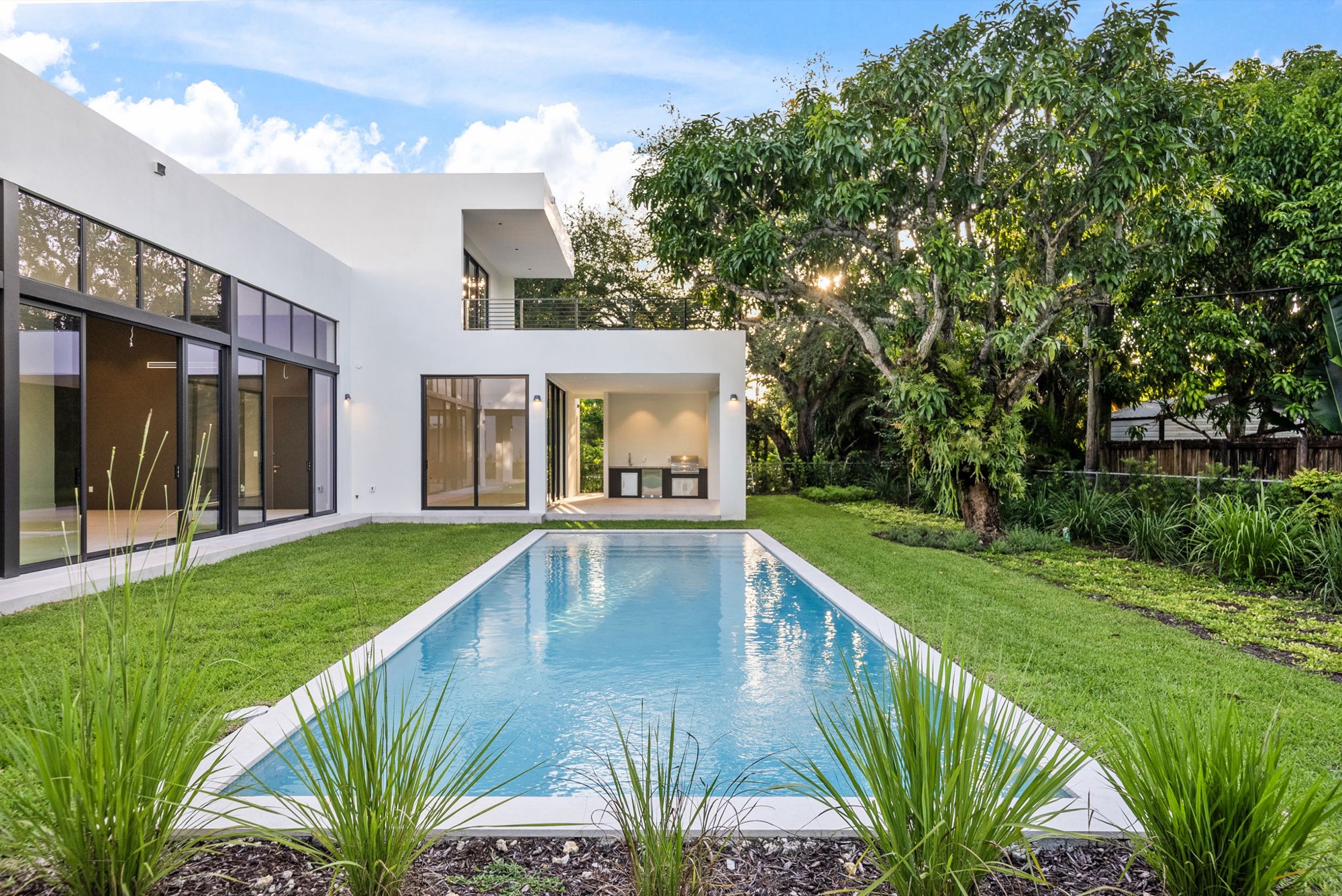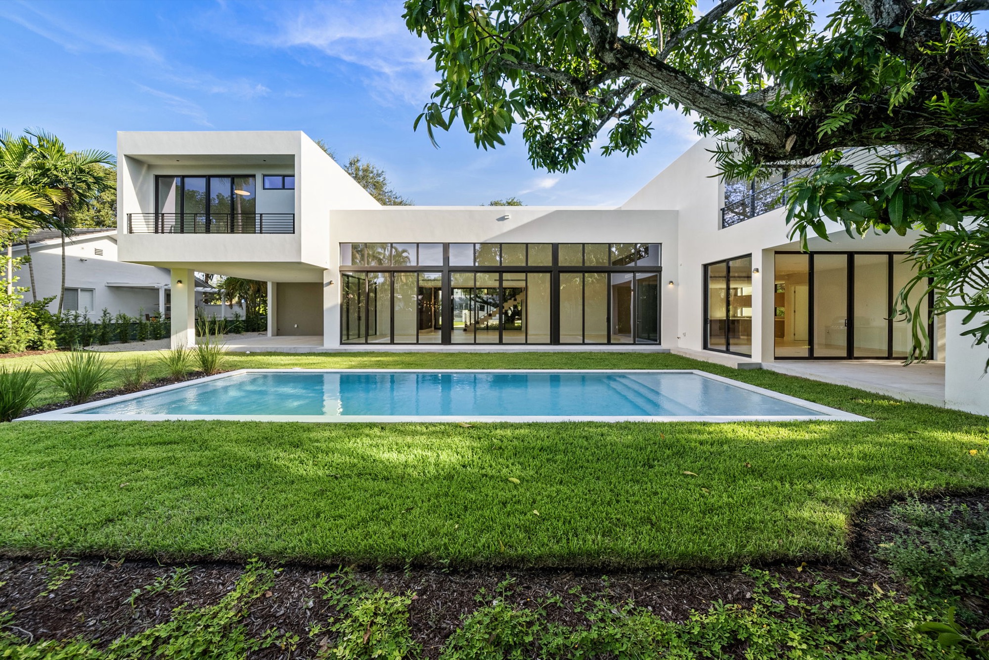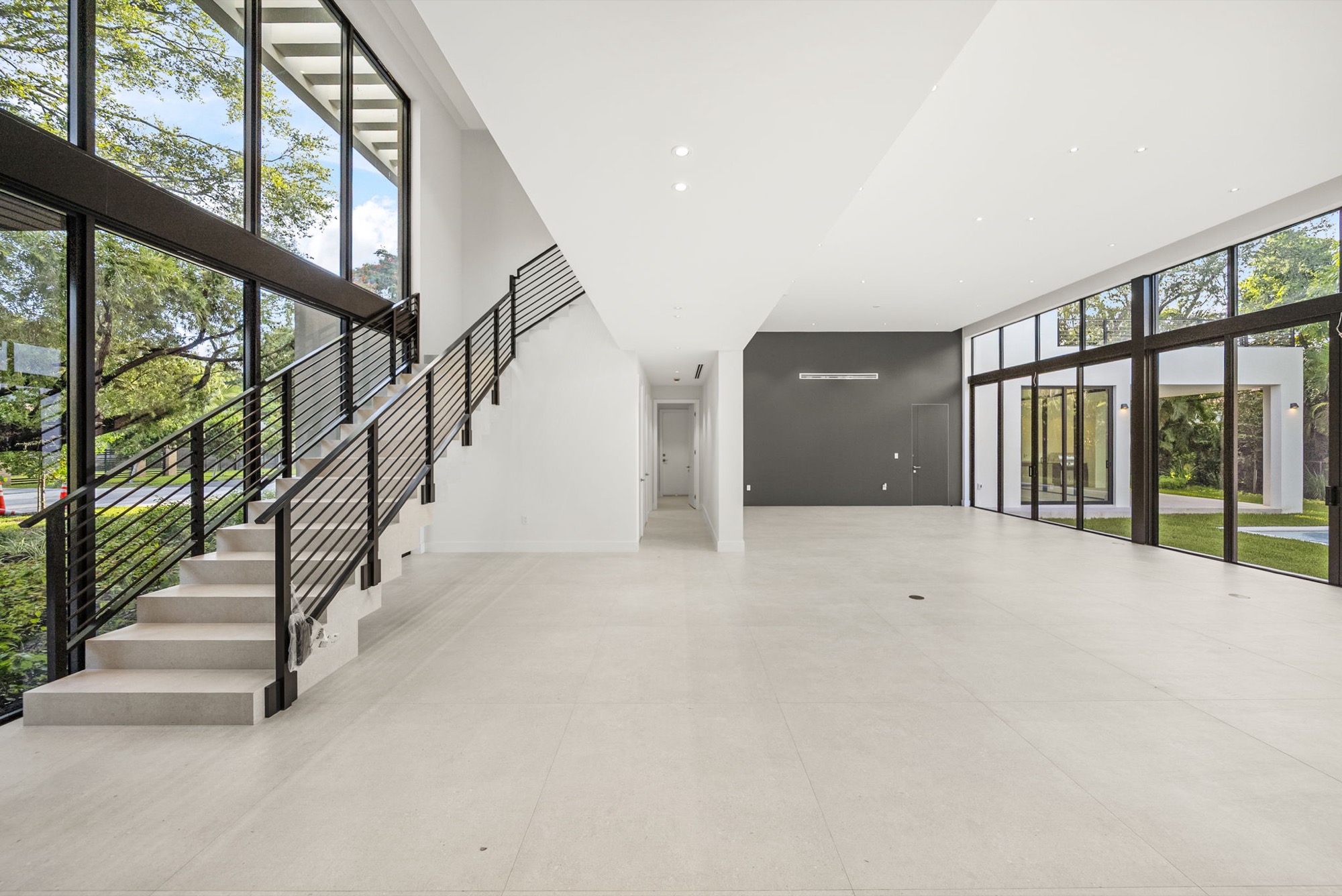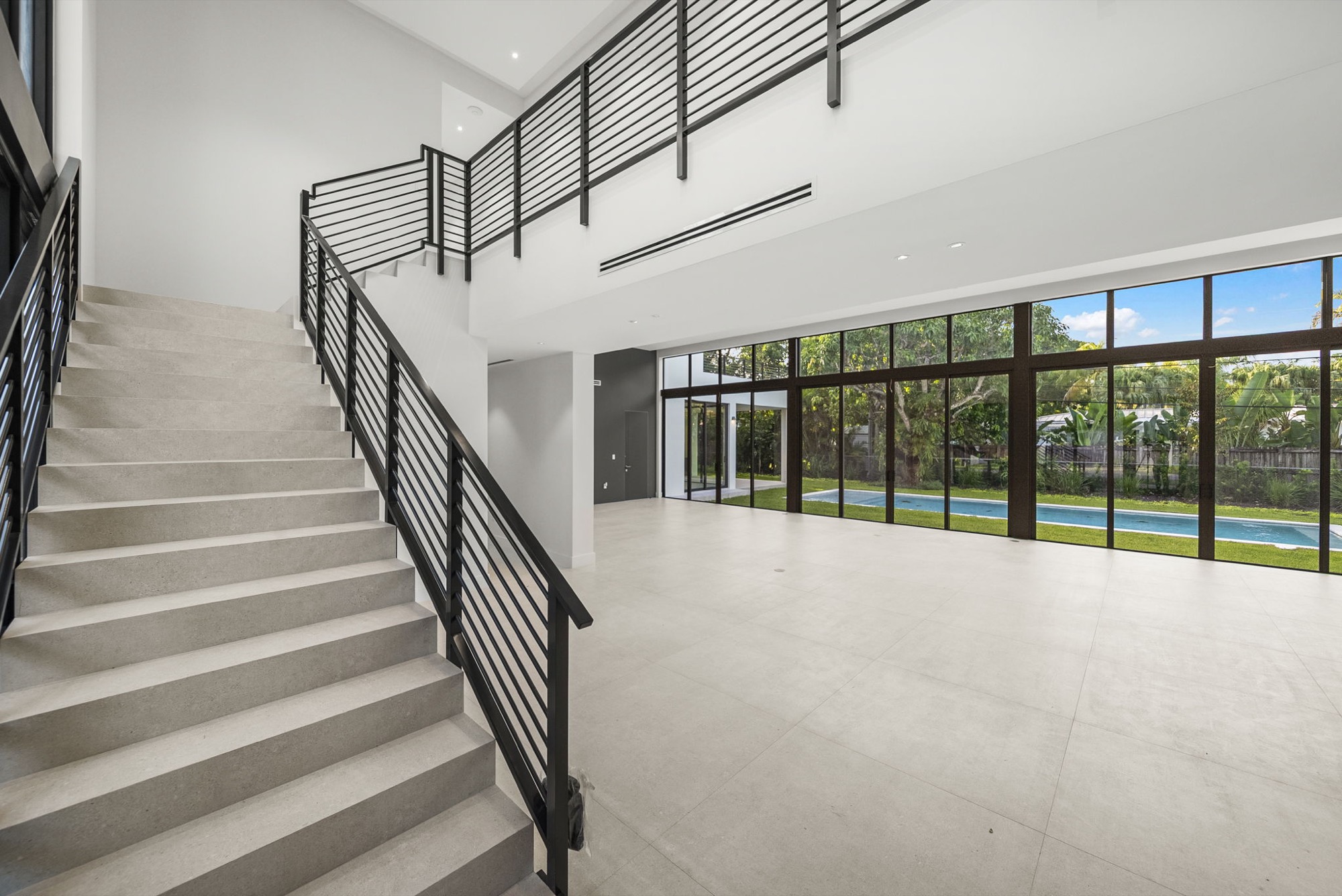 Our end result was a captivating two-winged house on two stories with a tropical modern style integrated with nature with an oversized Great Room with a higher-than-usual ceiling that opens to the whole backyard while also connecting the different home spaces.