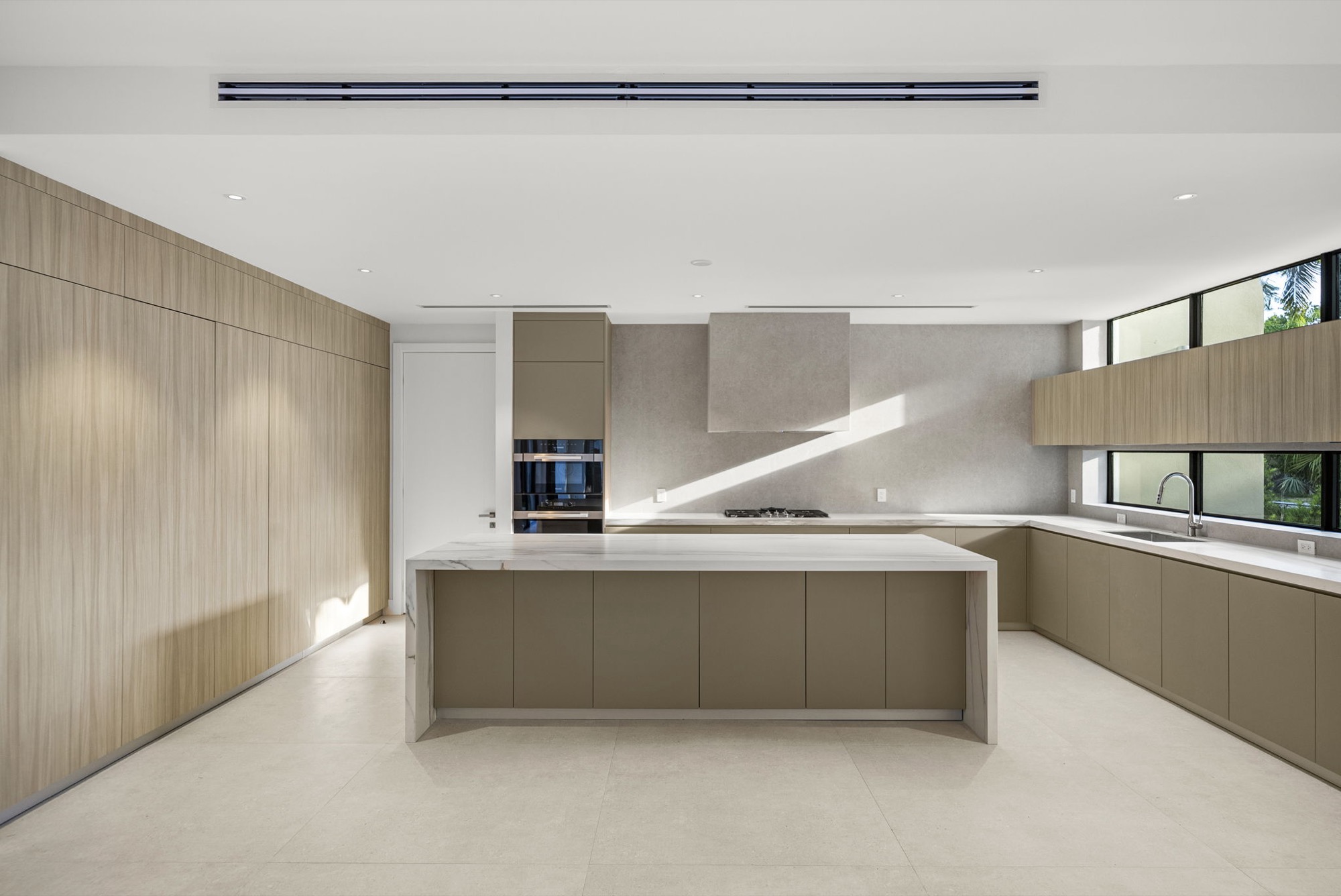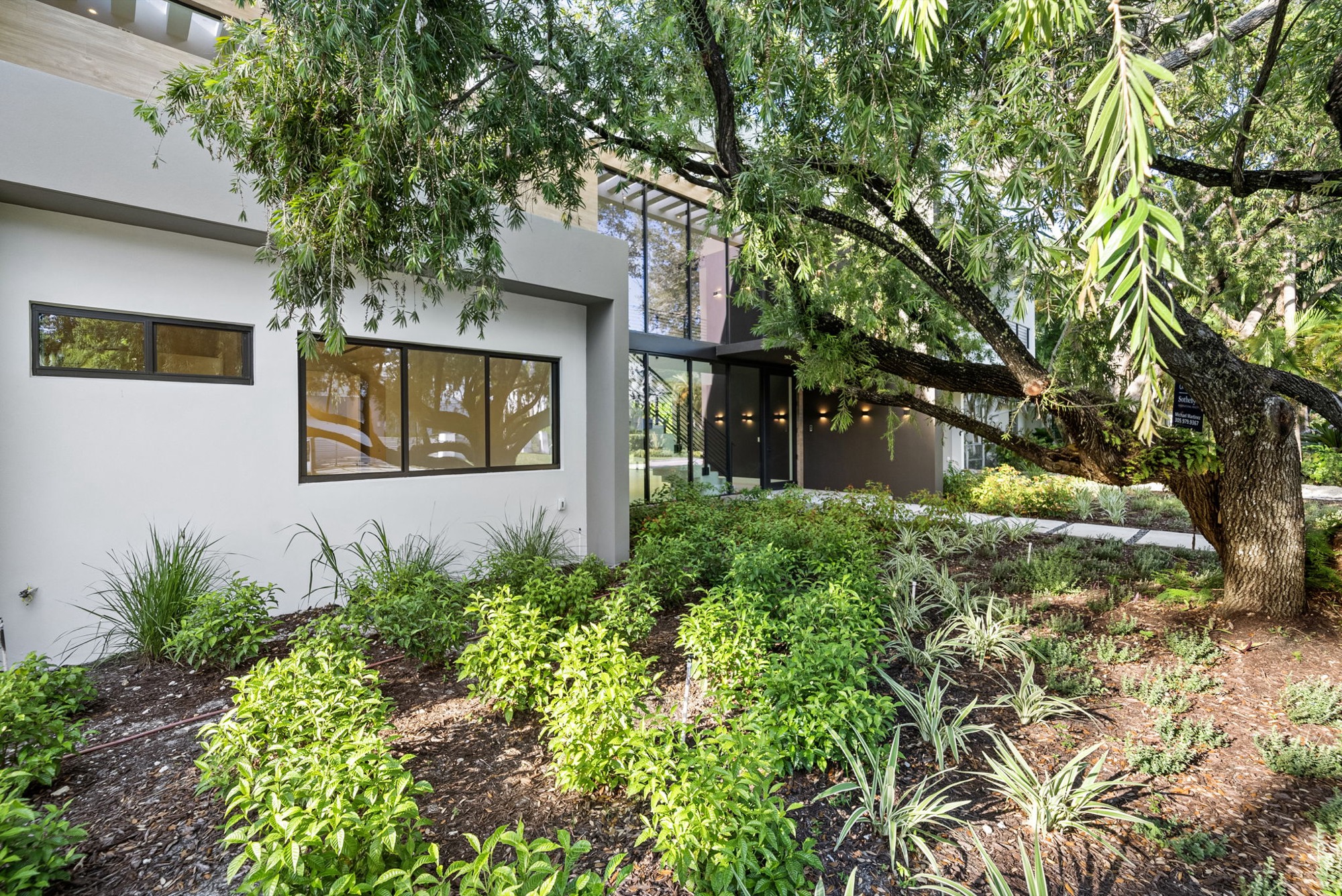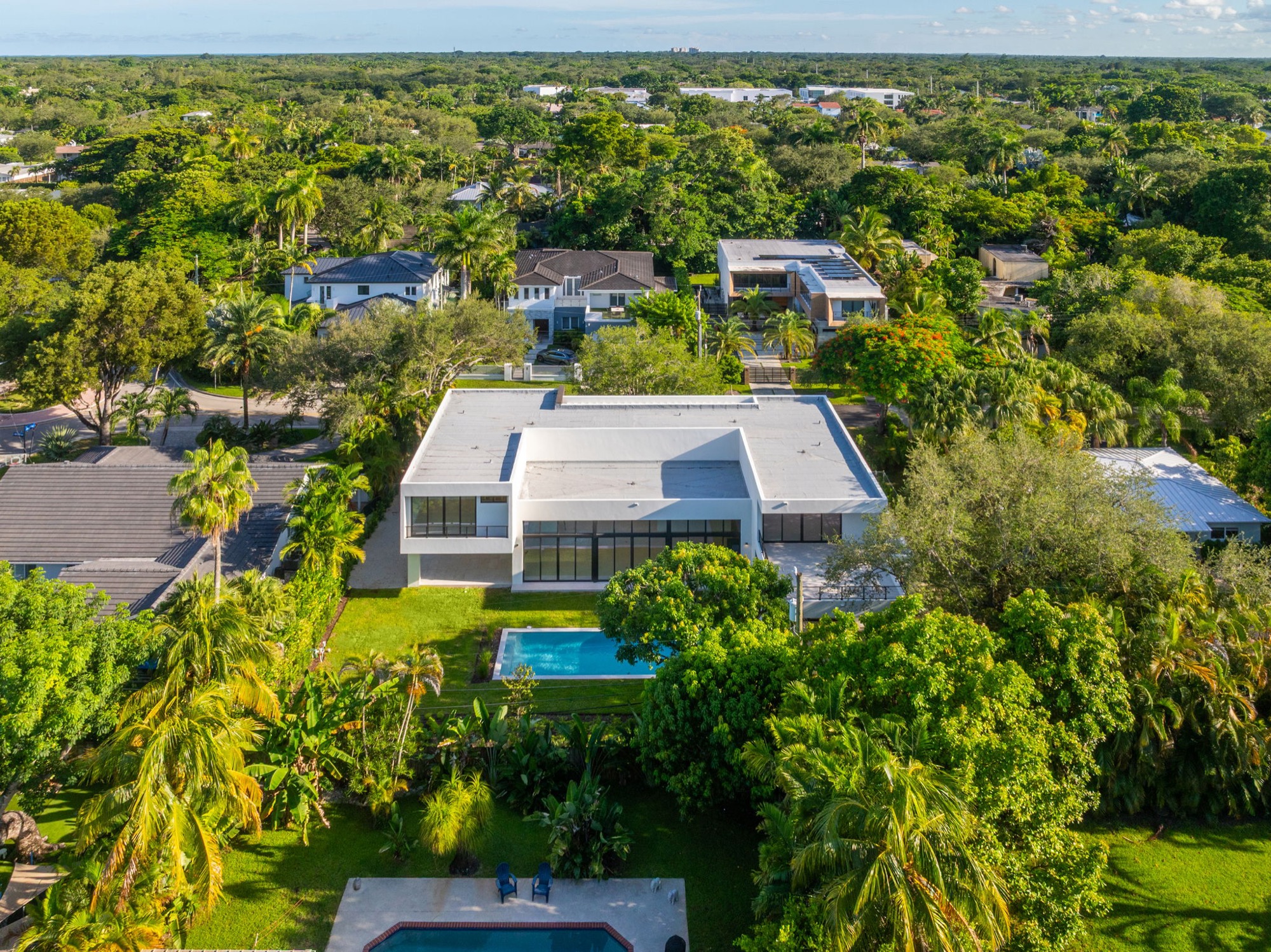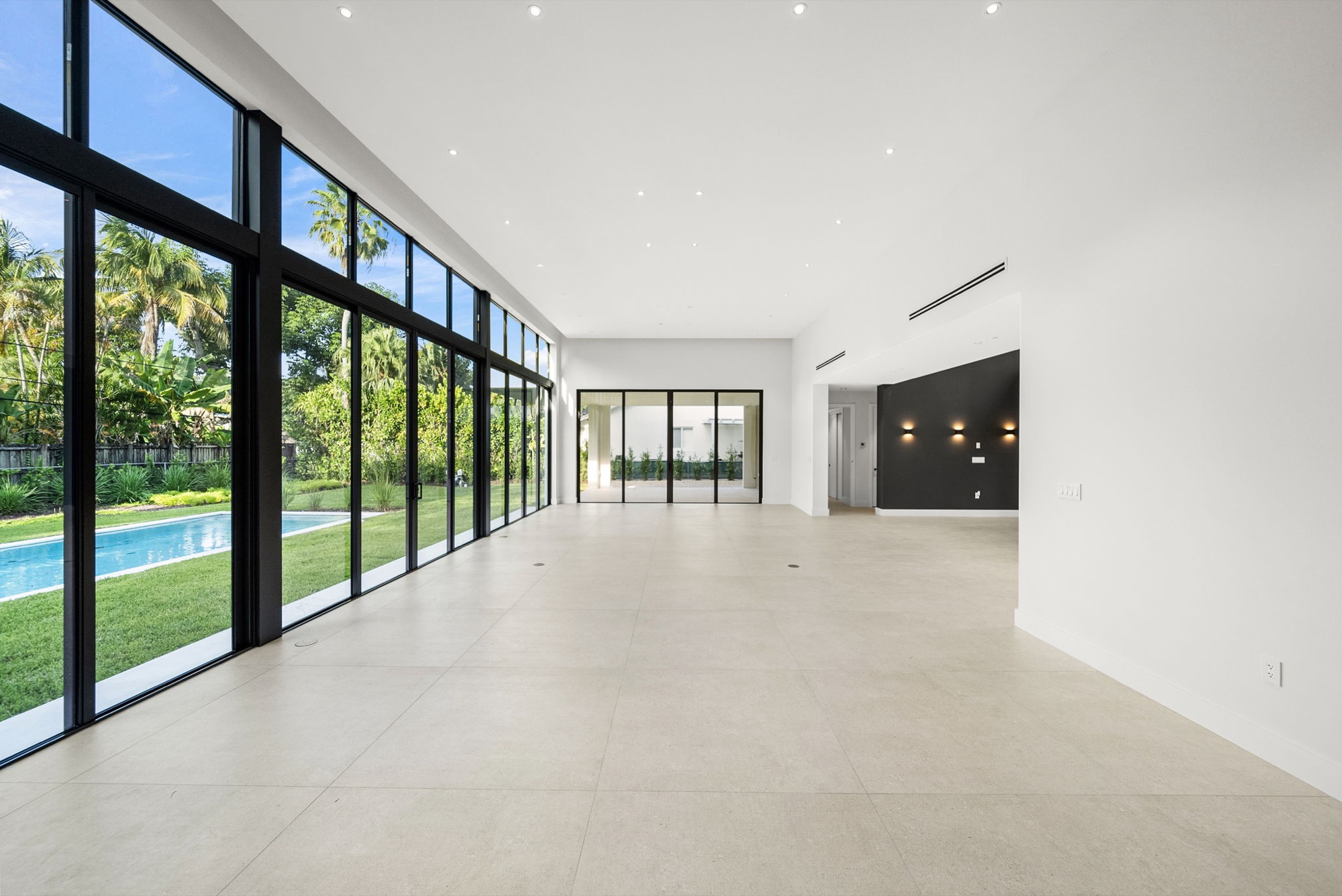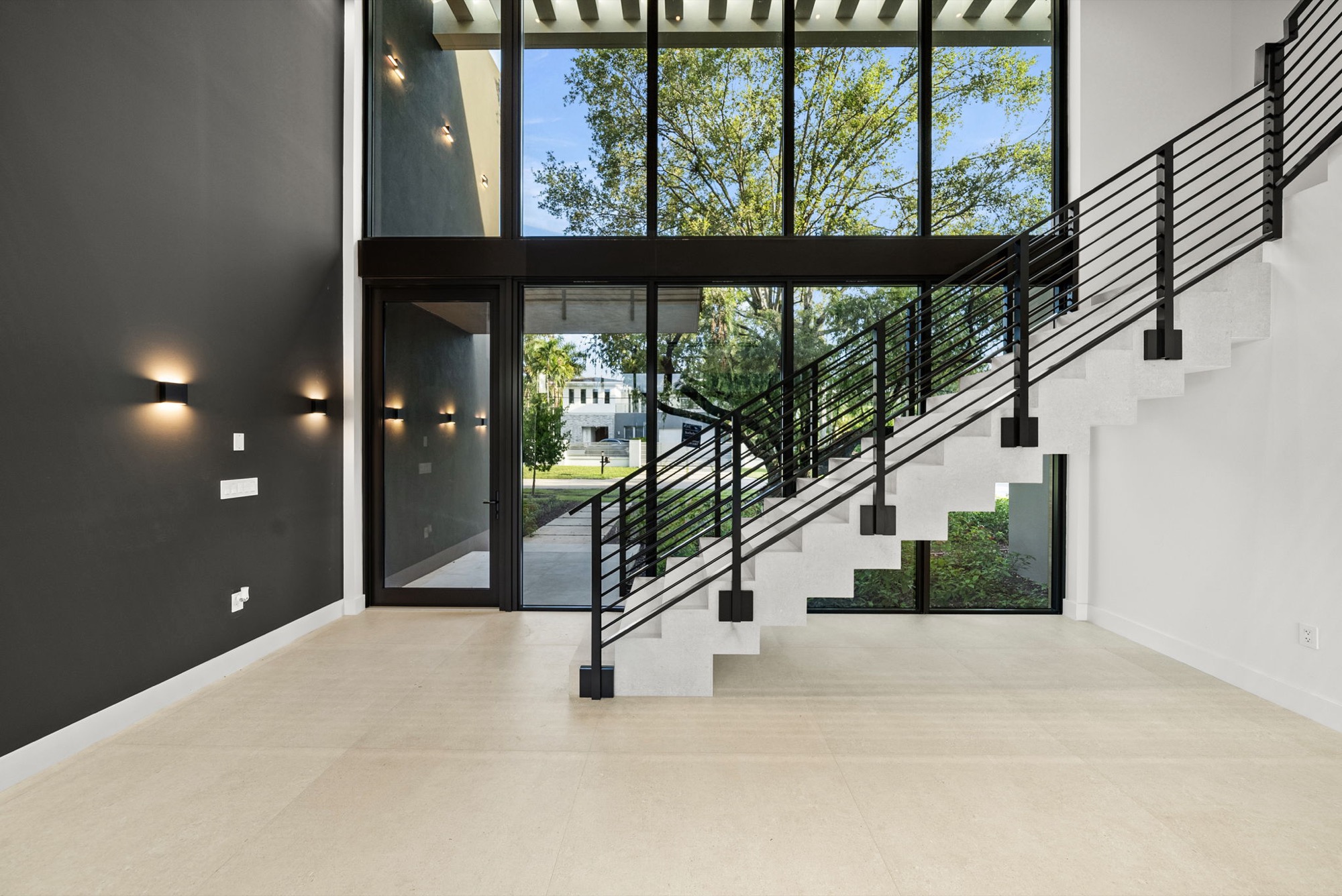 Our end result was a captivating two-winged house on two stories with a tropical modern style integrated with nature with an oversized Great Room with a higher-than-usual ceiling that opens to the whole backyard while also connecting the different home spaces.
