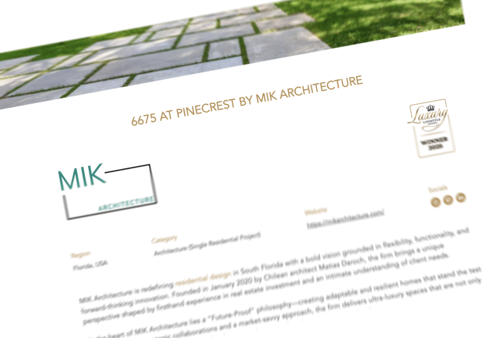 "We partner with developers and investors to create 'Future-Proof' homes that are as valuable as they are visionary, always guided by our core values of Marketable Modern, Integrity-Driven, and Knowledge-Powered design", Matias Daroch, principal at MIK Architecture.